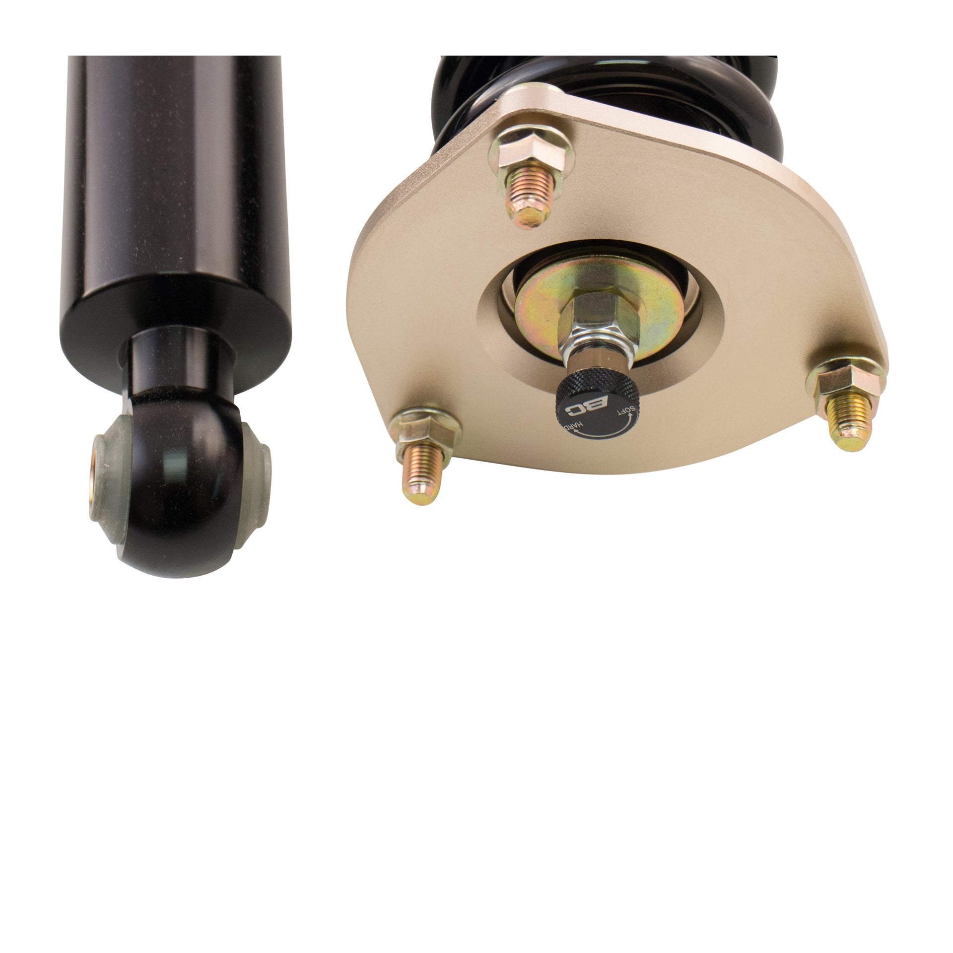 The BC Racing RM Series Coilover System uses a mono-tube inverted damper in the front and rear of vehicles that use McPherson style OEM strut suspension. On vehicles that use front struts only, BC Racing provides an inverted front strut and then provides an upright BR Series damper for the rear. Inverted dampers are useful in decreasing unsprung weight by moving the greatest mass of the strut to the top where it connects to the sprung weight of the chassis, where weight can be more easily shaved. The BC Racing RM Series Coilover System uses a much larger inverted piston shaft that can handle higher lateral loads for longer periods of time without fatigue. These higher lateral loads are only prevalent on McPherson style strut suspension, not on Double A-Arm vehicles.