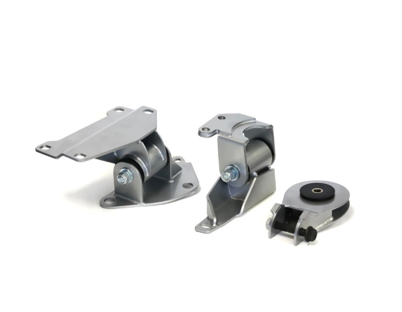 These mounts are designed to completely support the engine and transmission with durometer options to suit all styles of driving. All of our bushings can be replaced at any time. Mounts improve drive line response by inhibiting driveline lash, putting all that motion to the task of moving the car along.