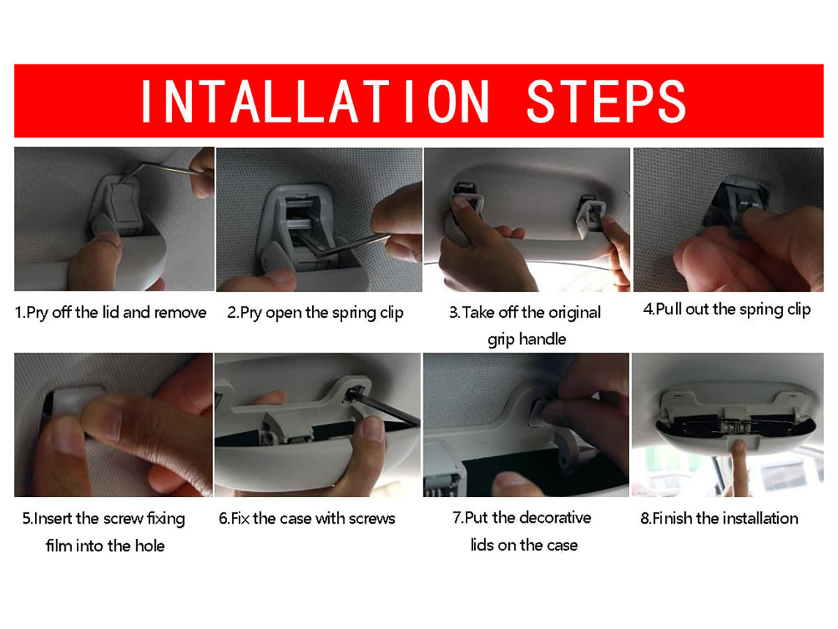 Designed for effortless functionality, the Grab Handle Sunglasses Case is simple to install and features a one-hand switch for quick and easy access. A high-quality damping spring ensures the case closes slowly and securely, protecting your glasses from scratches and preventing any rattling while driving. Compact yet spacious, with measurements of 8.2 x 3 inches, it offers the perfect storage solution without compromising space or style.