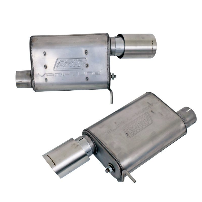 BBK Varitune cat back exhaust systems feature BBK Varitune mufflers that have a patented adjustable power valve inside that allows full adjustment of the exhaust flow through the mufflers chambers for a great sound and added performance. This adjustment is made at the rear of the muffler with a wrench by either moving the valve in or out. Once you are happy with the level of sound, it is locked in place with the Varitune locking nut. All of the Varitune power valves are made with stainless steel for lasting durability and smooth operation. These patented BBK Varitune exhaust systems allow you to personalize the power and sound levels of your car 8-10 decibels and 10-15 horsepower. This kit is built with aluminized steel with brushed stainless steel tips. Each Kit is a direct bolt on replacement for the restrictive factory exhaust. NOTE: Does NOT fit convertible applications.