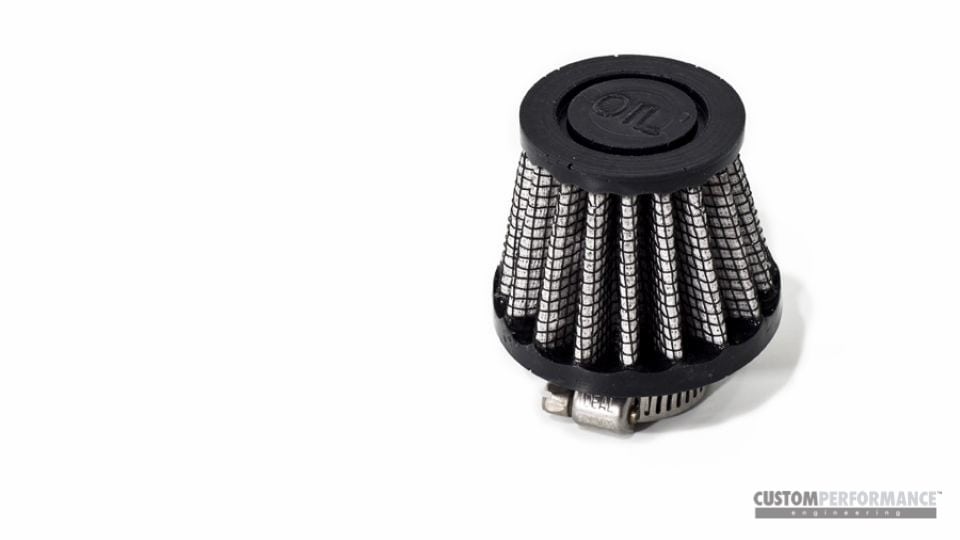 Want to get rid of the awkward breather hose that goes from the valve cover to the side of your performance intake? Now you can with the cp-e™ oiled breather filter. This little guy attaches right to the nipple coming off of the valve cover, which eliminates the need for the factory rubber recirculation hose. This is also the standard breather filter that is included with the XcelXL™.