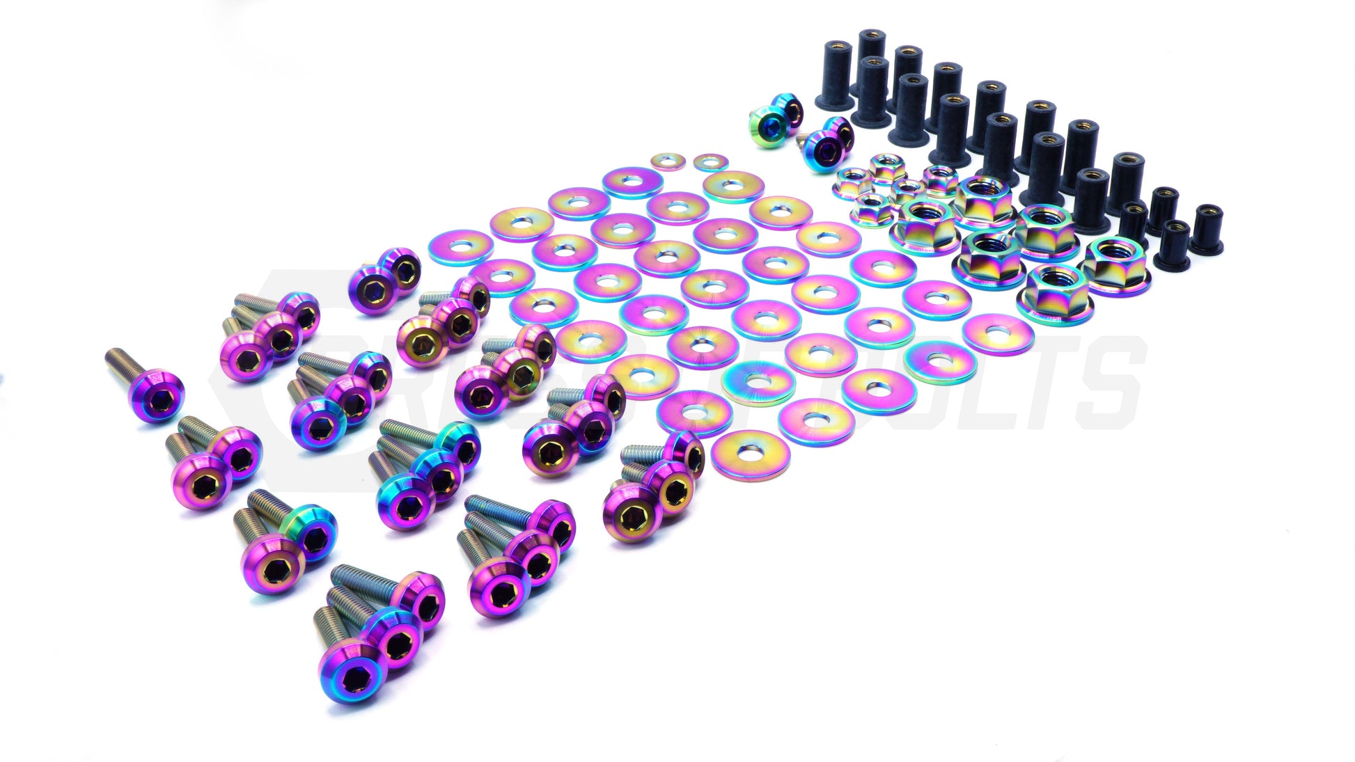 Our 103 piece Stage 2 engine bay kit includes bolts, nuts, and washers manufactured from extremely durable, anticorrosive, and lightweight GR5 titanium metal. The kit is designed for the Mazda Speed 3 2007-2009 (BX).