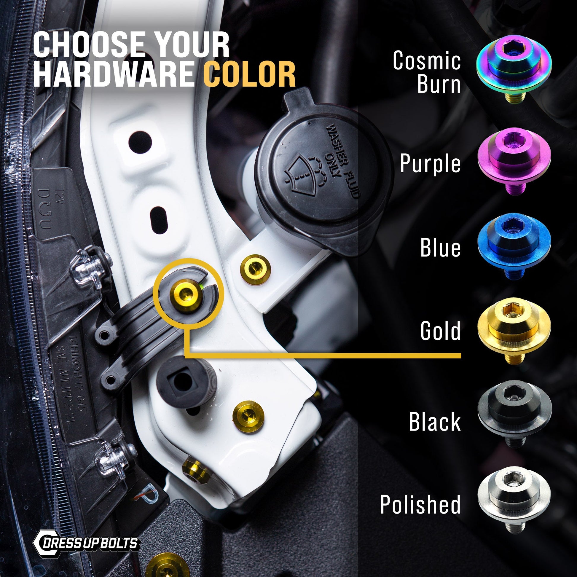 Our MK8 GTI engine bay kit includes 26 titanium bolts, 1 titanium nut, and 20 titanium washers. The kit replaces the hardware circled in the diagram above. The GTI engine bay kit comes with clear instructions that walk you through where to place each hardware piece, ensuring a fast and effortless setup.