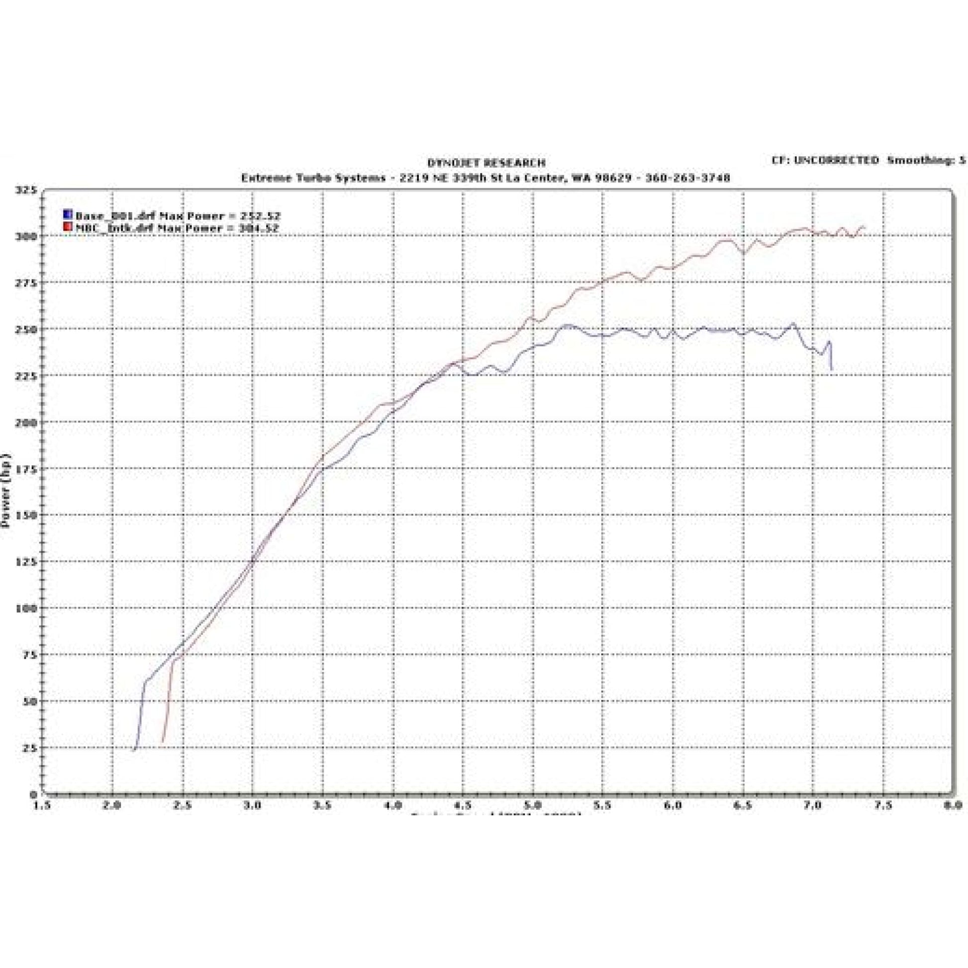This intake has been dyno proven to gain over 56whp when used with a boost controller at 22psi on the factory turbocharger, and even more with an aftermarket turbocharger!