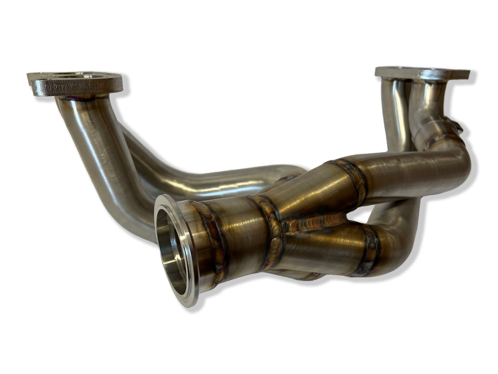 We designed our ETS V2 MaxFlow Header for customers that want to design their own front facing turbo kit. We start off with large 1 7/8 primary runners that come together in a true low angle 4-1 merge collector that then flow into a huge 2.5" secondary for maximum scavenging and exhaust flow.
