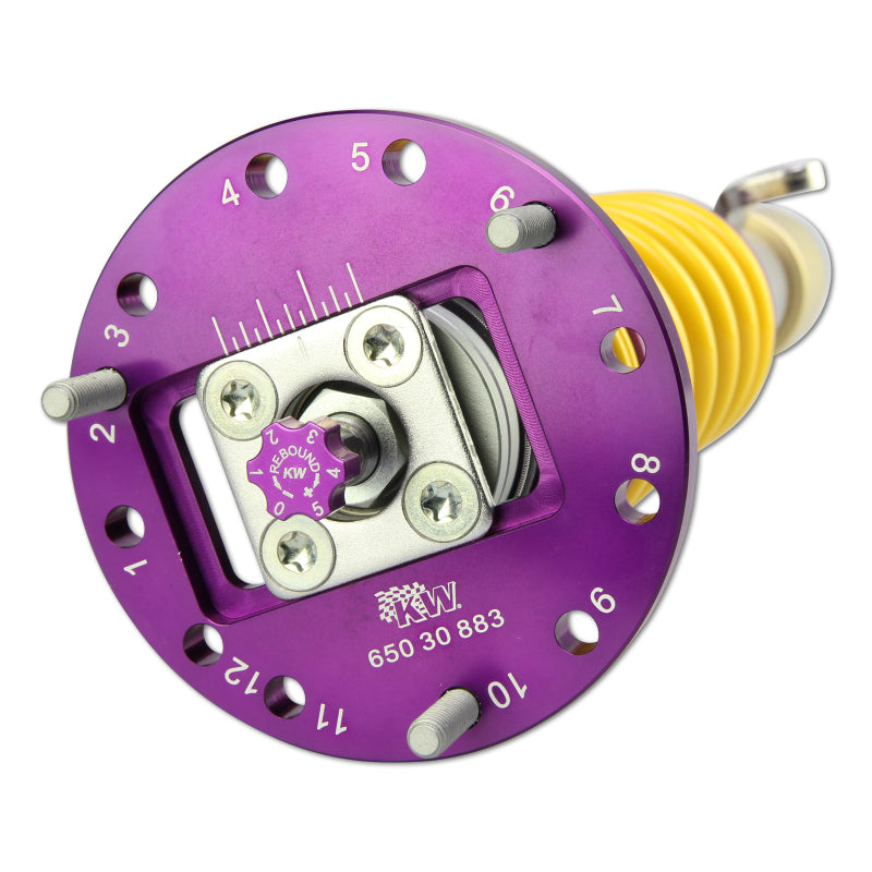 Using the Nordschleife as it's testing grounds and the 7-post rig, KW developed it's V4 Clubsport coilover kit. Wheel loads, vehicle weight and chassis reinforcements (increased body stiffness) can all be taken into consideration with Adjustment -capabilities of the V4 Clubsport. The KW Clubsport coilovers combine KW's high-end racing technology -with maintenance-free KW OEM quality components. Designed to provide you the ideal product to utilize the full potential of your sports car during autocross, track days, high performance drivers education (HPDE) courses, club racing, and is tested rigorously on race tracks such as the Nurburgring Nordschleife. Race teams rely on KW's racing expertise and experience for their vehicle setup. This same championship winning pedigree is mirrored in the development of each one of the KW Clubsport coilover systems. Similar to the KW Competition suspension used in international motorsports, the KW V4 Clubsport coilover kit allows fine tuning of the compression damping separately in the low-speed and high-speed range. The click adjustments of the TVCLH-A valve technology -ake for easy Adjustment -directly on the reservoir. You can modify the low-speed compression damping with 6 precise clicks with the purple low speed Adjustment -ial and directly beneath it the golden Adjustment -heel provides an additional 14 precise clicks of high speed compression adjustment. In addition, the TVR-A technology -provides 16 clicks to noticeably adjust the rebound damping independently of the compression damping. If you would like to adjust the KW V4 Clubsport coilover kit it can easily be adjusted for more comfort or to an alternative setup for a new race track. The KW V4 Clubsport benefits from the same motorsports technology -hat has proven its endurance with multiple overall wins at the ADAC Zurich 24h Nurburgring race.