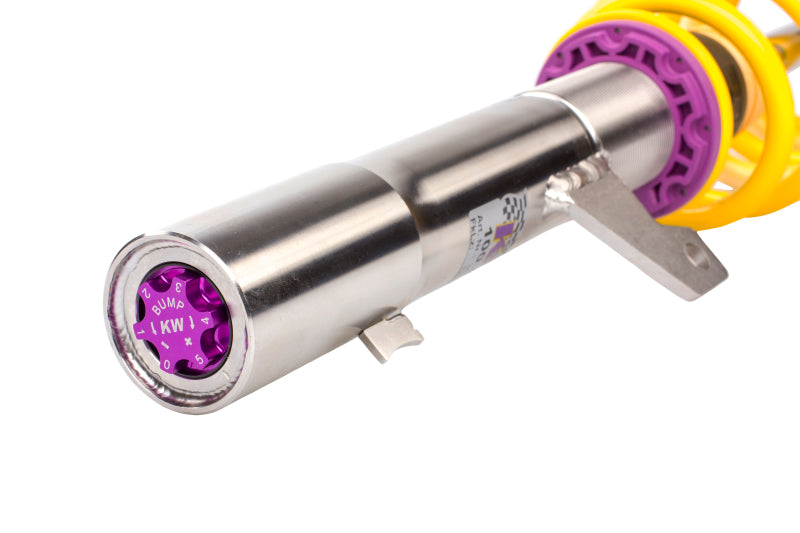 Cutting-edge motorsports technology for more performance on the road. Like every suspension product developed by KW automotive, the suspension manufacturer, and manufactured in Germany, the KW V3 Coilover suspension kit also provides a significant plus in safety reserves in road traffic. Thanks to the chassis with its high-quality dampers, springs, and elastomer spring elements, pitching and rolling movements during load changes such as evasive maneuvers, cornering, acceleration, and braking are significantly reduced. The braking distances are also shortened. Thanks to improved support and feedback, drivers not only feel safer but driving in everyday life becomes even safer. With compression and rebound stage damping, that can be set separately and independently of each other, the damper setup can be customized to your personal driving preferences or vehicle changes such as weight, tire characteristics, or altered vehicle rigidity. True performance optimization is only possible with this unique, patented system. For example, this allows the compression damping force to be increased and get more grip from the tires, to improve cornering behavior and reduce squat without simultaneously altering the rebound sta ge damping which is optimally matched to the spring rate, a scenario which results in reduced grip and the associated loss of performance. The KW V3 coilover kit is the ideal tool for performance-oriented drivers and experienced tuning enthusiasts who place a strong emphasis on the overall performance of their suspension. The Variant 3 features patented TVR-A and TVC-A technology that provides separately adjustable rebound and compression damping. The extensive adjustment range of the independently configurable rebound and compression make it easy to directly influence the steering behavior, directional stability, grip and handling characteristics for confident and repeatable results at the limit of driving dynamics.