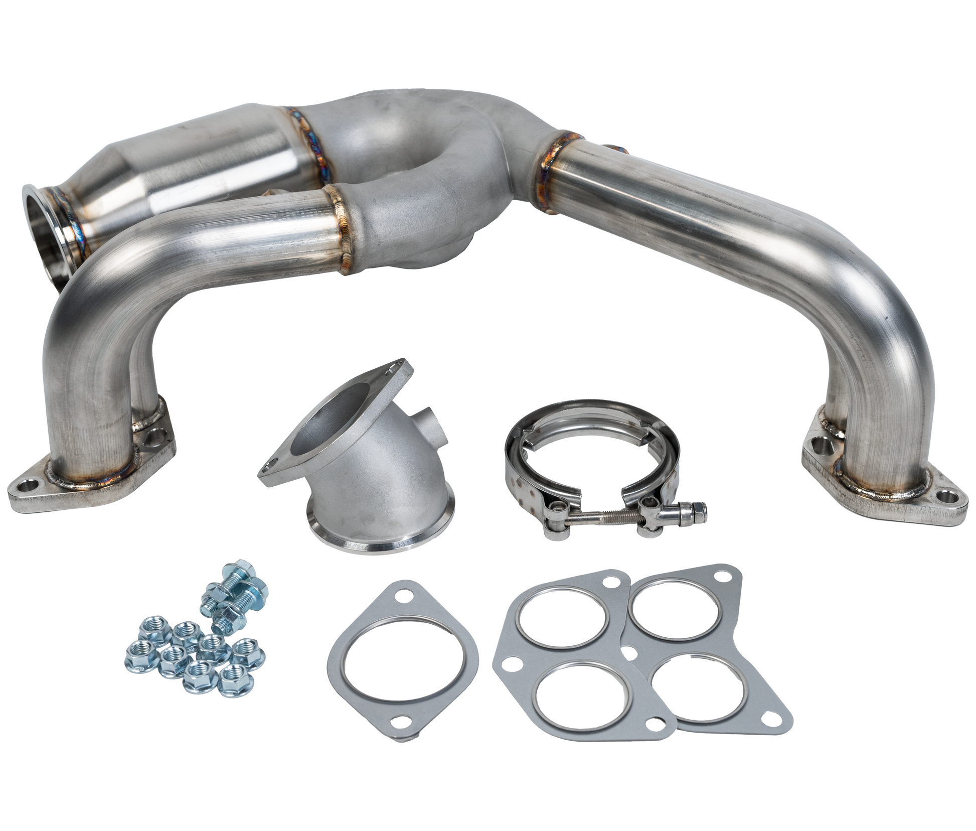 The cast collector is made from high-grade stainless steel and welded to mandrel bent stainless runners. The header fits up to the OEM overpipe flange, ensuring compatibility and ease of installation.