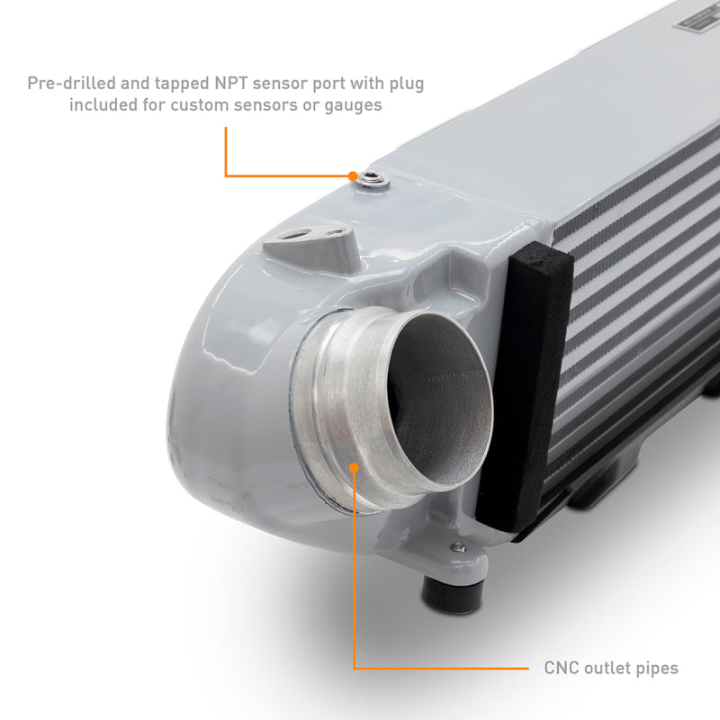 Take your 2024+ Ford Mustang EcoBoost to the next level with the Mishimoto Performance Intercooler. Engineered for maximum cooling efficiency and reliability, this direct-fit intercooler is built to handle the demands of spirited driving while remaining safe to run on the stock tune. Featuring a robust bar-and-plate core with cast aluminum end tanks, it delivers improved airflow, reduced intake temperatures, and increased power for your EcoBoost Mustang.--The Mishimoto intercooler boasts the largest possible core size that can fit in the stock location, providing a 60% increase in core volume compared to the factory unit. Oversized 63mm inlet and outlet diameters outflow the stock system for better charge air movement, while a diverter plate in the hot-side end tank promotes even airflow distribution across the core. Gains of up to 12 horsepower and 11 ft-lbs of torque can be achieved without any tuning required.--Installation is simple and fully compatible with stock ducting and both OEM and Mishimoto intercooler pipes, with no cutting required. Foam sealing strips ensure maximum airflow through the core, and a custom vacuum-formed bottom air deflector improves underbody flow while reducing NVH thanks to its ribbed structure. To support the increased weight of the larger core, the intercooler mounts directly to the subframe using four EPDM rubber sandwich mounts, isolating vibration and increasing overall rigidity.--Every intercooler comes equipped with a pre-drilled and tapped NPT sensor port for data logging or the addition of auxiliary sensors. All necessary hardware is included for a straightforward installation.--The Mishimoto Performance Intercooler for the 2024+ Ford Mustang EcoBoost is built for enthusiasts who want lower intake temps, increased power, and a long-lasting solution to keep their Mustang running strong. Like all Mishimoto products, this intercooler is backed by the Mishimoto Lifetime Warranty.