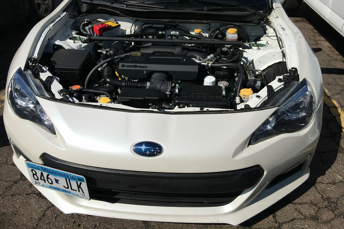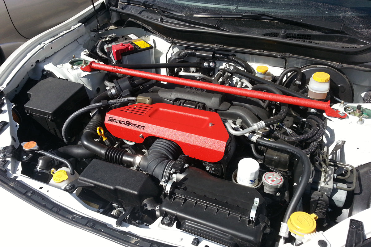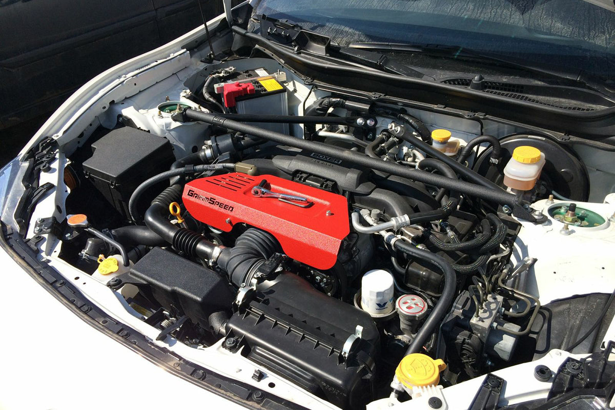 This cover mounts securely in place of your plastic factory covers and its asymmetric Design compliments the BRZ/FRS/86 engine bay nicely. Available in either Red or Black textured powder coat to match the rest of your GrimmSpeed engine bay parts!