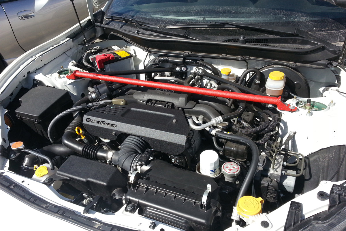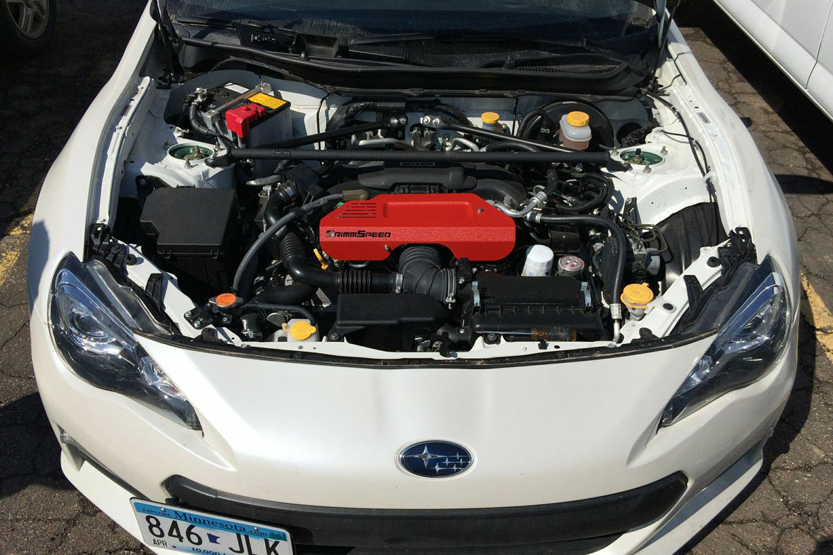 This cover mounts securely in place of your plastic factory covers and its asymmetric Design compliments the BRZ/FRS/86 engine bay nicely. Available in either Red or Black textured powder coat to match the rest of your GrimmSpeed engine bay parts!