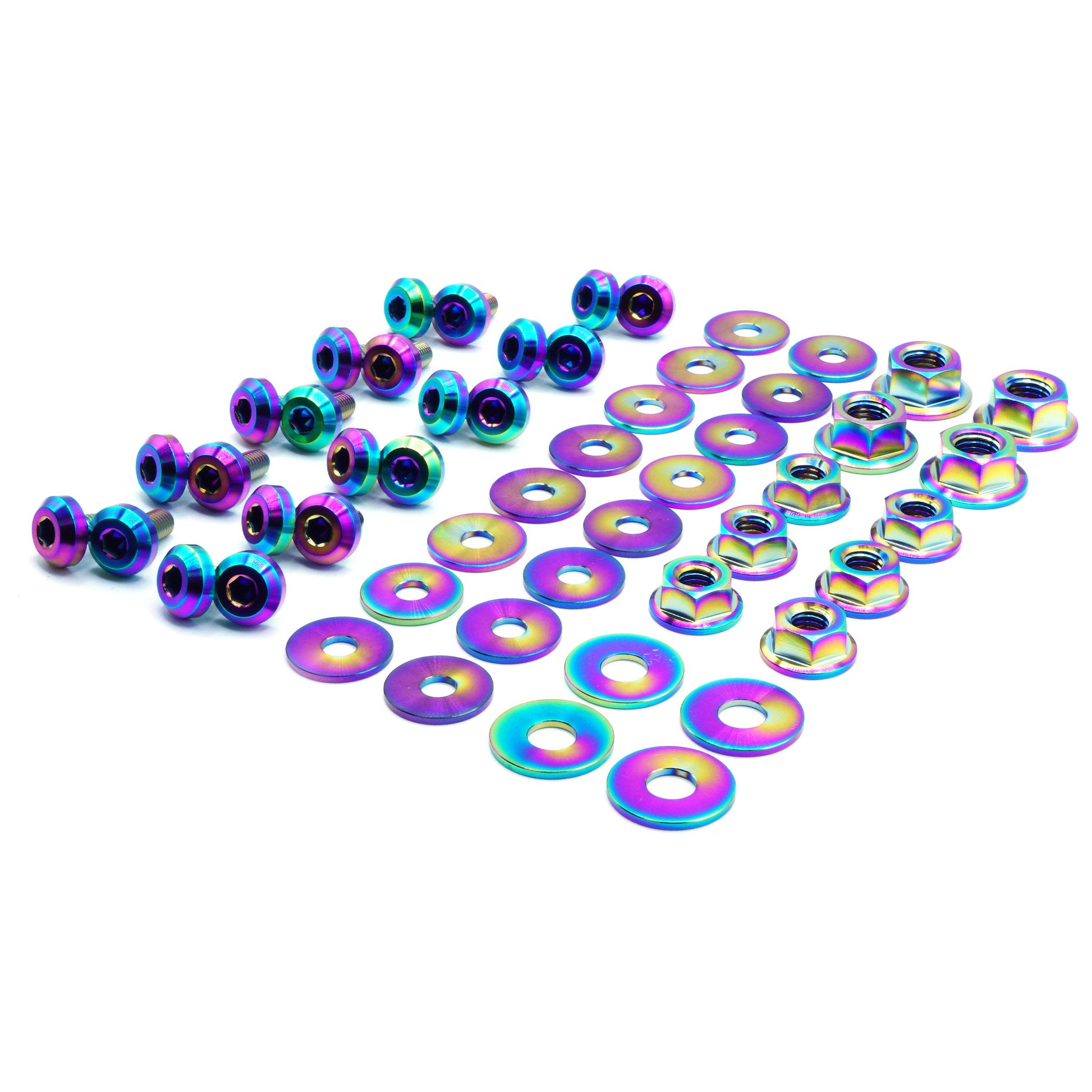 Our 52 piece Stage 1 engine bay kit includes bolts, screws, nuts, and washers manufactured from extremely durable, anticorrosive, and lightweight GR5 titanium metal. The kit is designed for the BMW E46 M3.