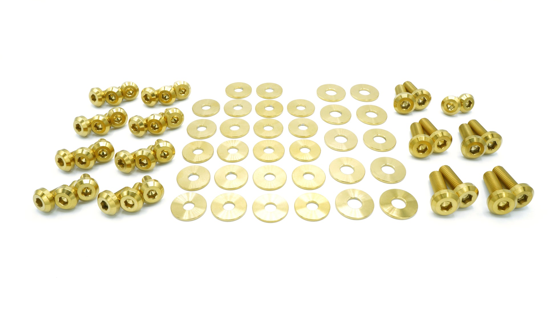 This 68 piece kit includes bolts, screws, nuts, and washers manufactured from extremely durable, anticorrosive, and lightweight GR5 titanium metal.