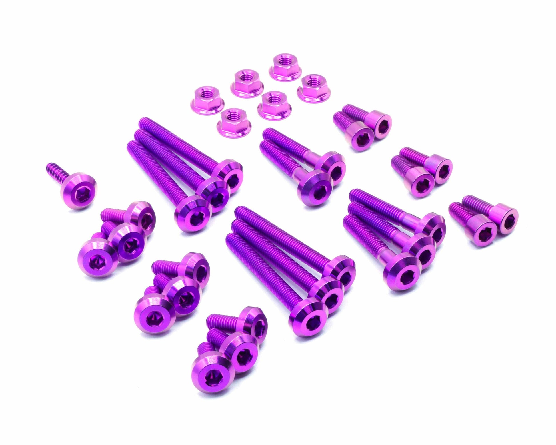This 33 piece kit includes bolts, screws, nuts, and washers manufactured from extremely durable, anticorrosive, and lightweight GR5 titanium metal.