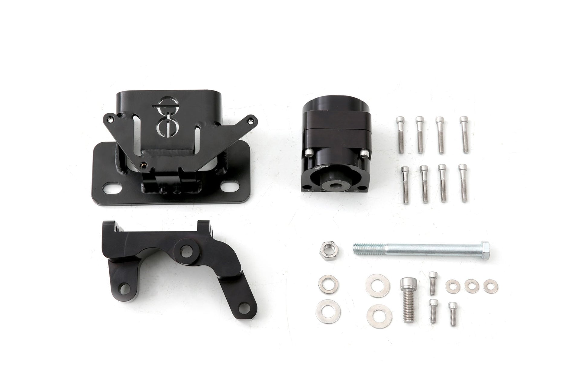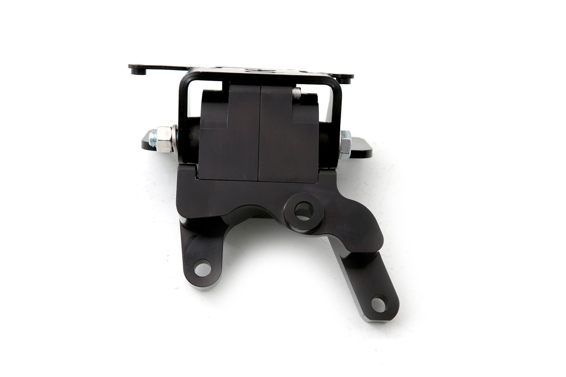 The driver side engine mount brackets are made from 1/4" mild steel that is laser cut for precise fitment. The bushing housing is CNC machined from a solid block of aluminum. And like our rear motor mounts these bushings are made from rubber instead of urethane.
